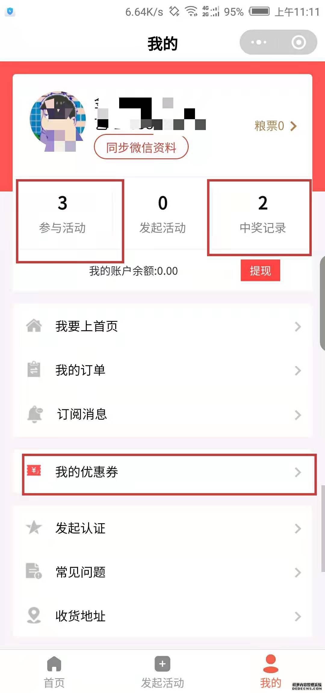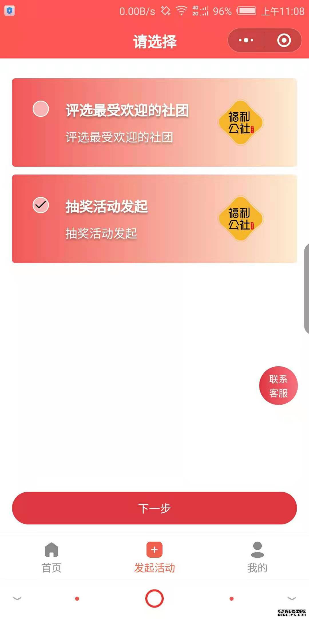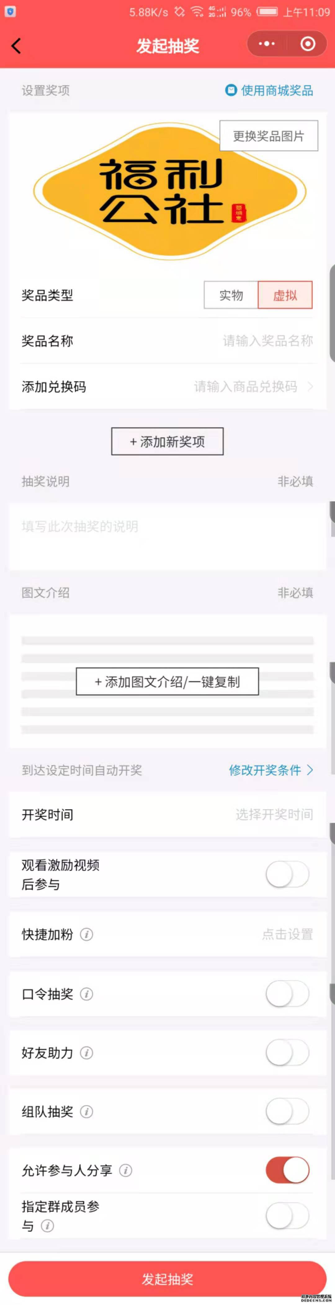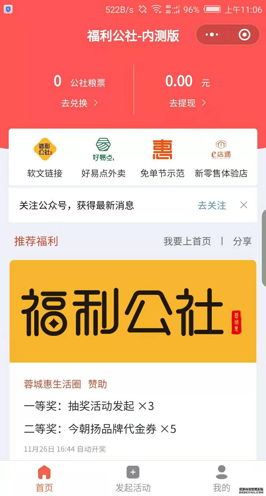 福利公社抽奖平台 第一步:抽奖活动首页展示 第二步:发起活动 第三步:建立活动,活动内容、规则、开奖时间等内容填写 第四步:在个人中心查看参与过的活动及中奖纪录,中奖后可在我的优惠券处查看核销码到店核销使用